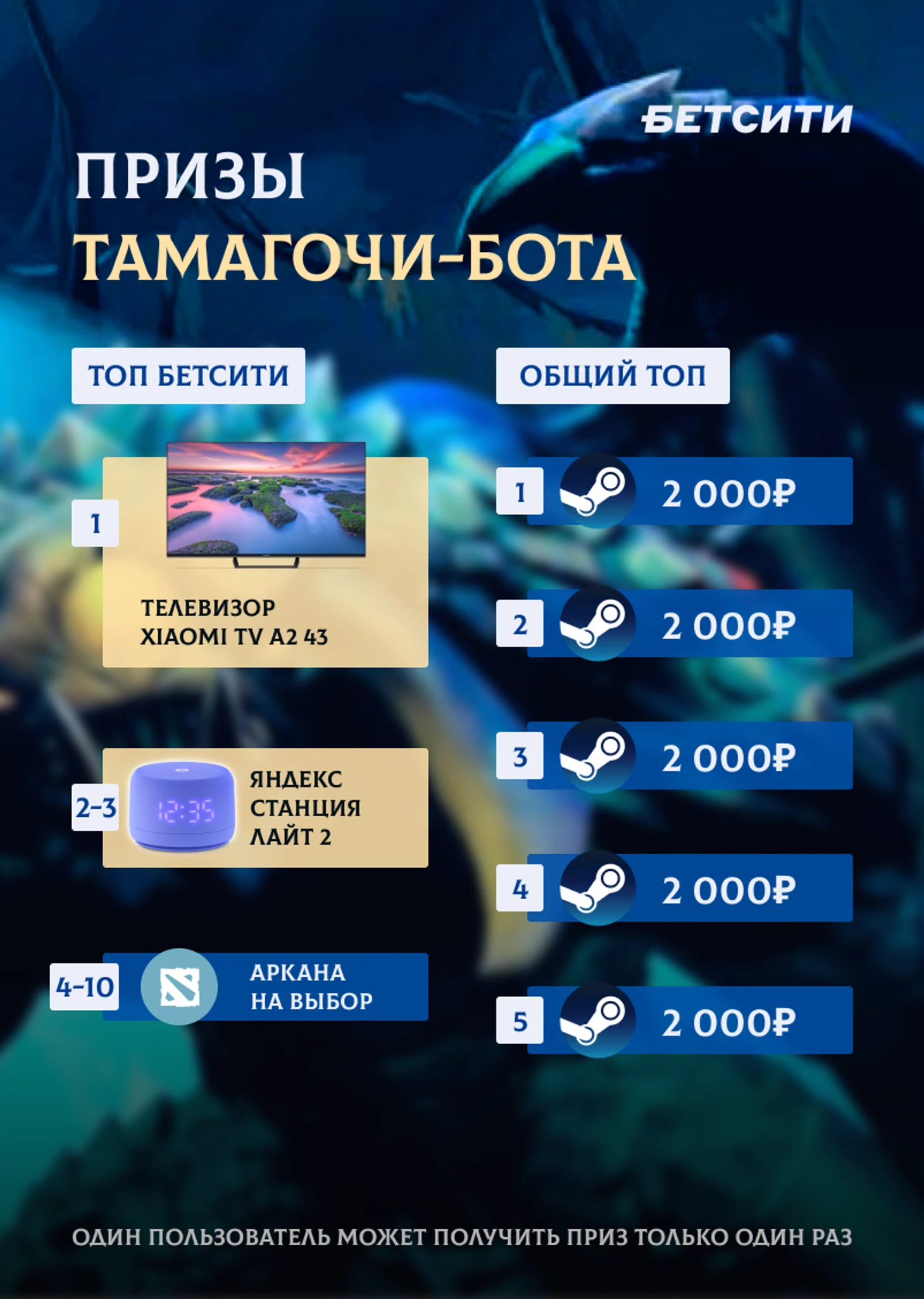 Победителями общего топа станут 5 пользователей, которые набрали больше всего силы. Для тех, кто зарегистрируется в БЕТСИТИ, будут особые призы – их получат 10 пользователей с наибольшим количеством силы.