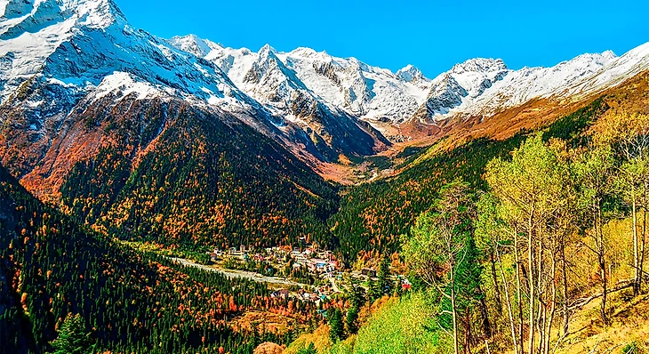 Осенью, когда дневная температура держится в районе приятных 16-18 °С, а ночью опускается до освежающих 7 °С, Домбай раскрывается с новой стороны. Исчезает назойливая мошкара, открывая возможности для комфортных ночевок под звездным небом, увлекательных трекинговых маршрутов и неспешных конных прогулок. Экологические тропы, проложенные по живописным ущельям, ведут к захватывающим водопадам, даря незабываемые впечатления.