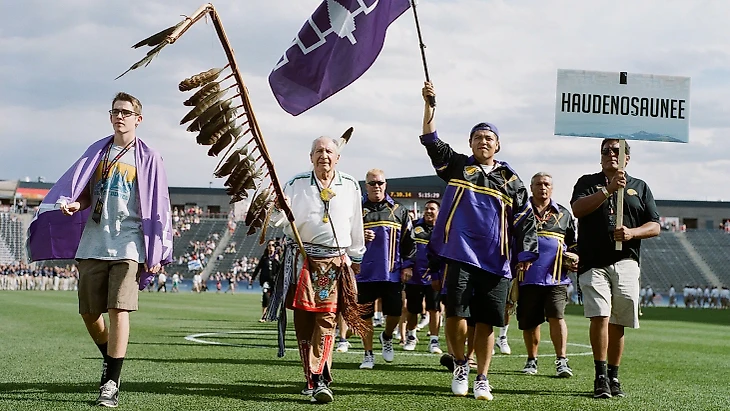 Часть племён ирокезов живёт в США, а часть в Канаде, - но при этом у них собственная федерация Haudenosaunee Nationals, которая под своим флагом играет на чемпионатах мира и регулярно показывает высокие результаты.