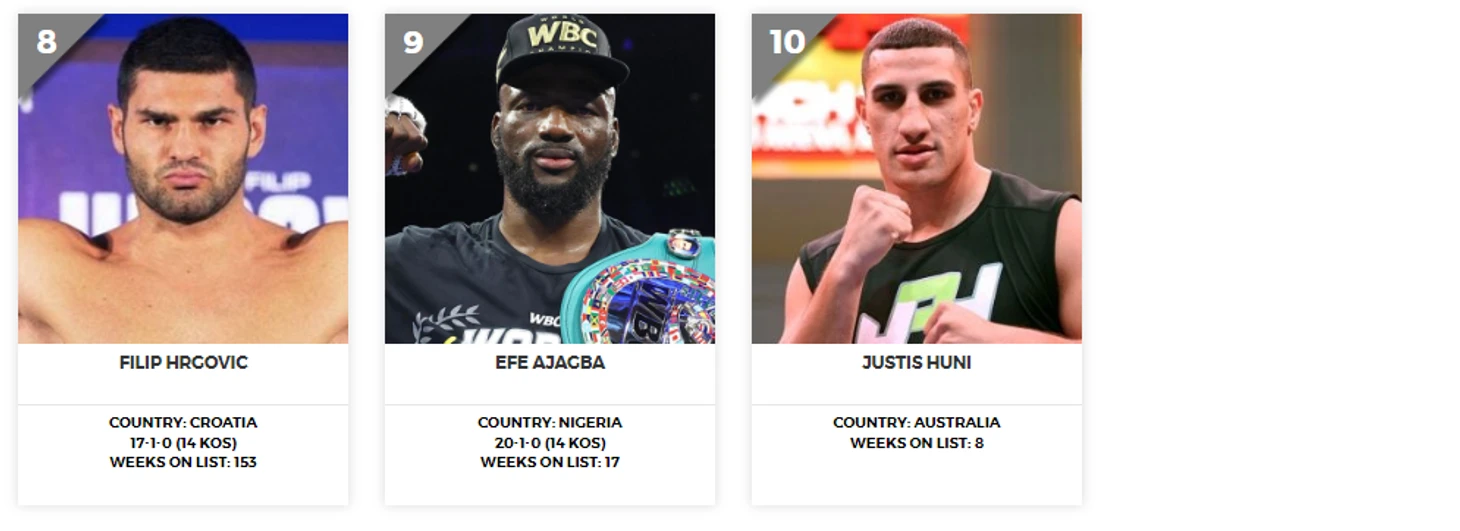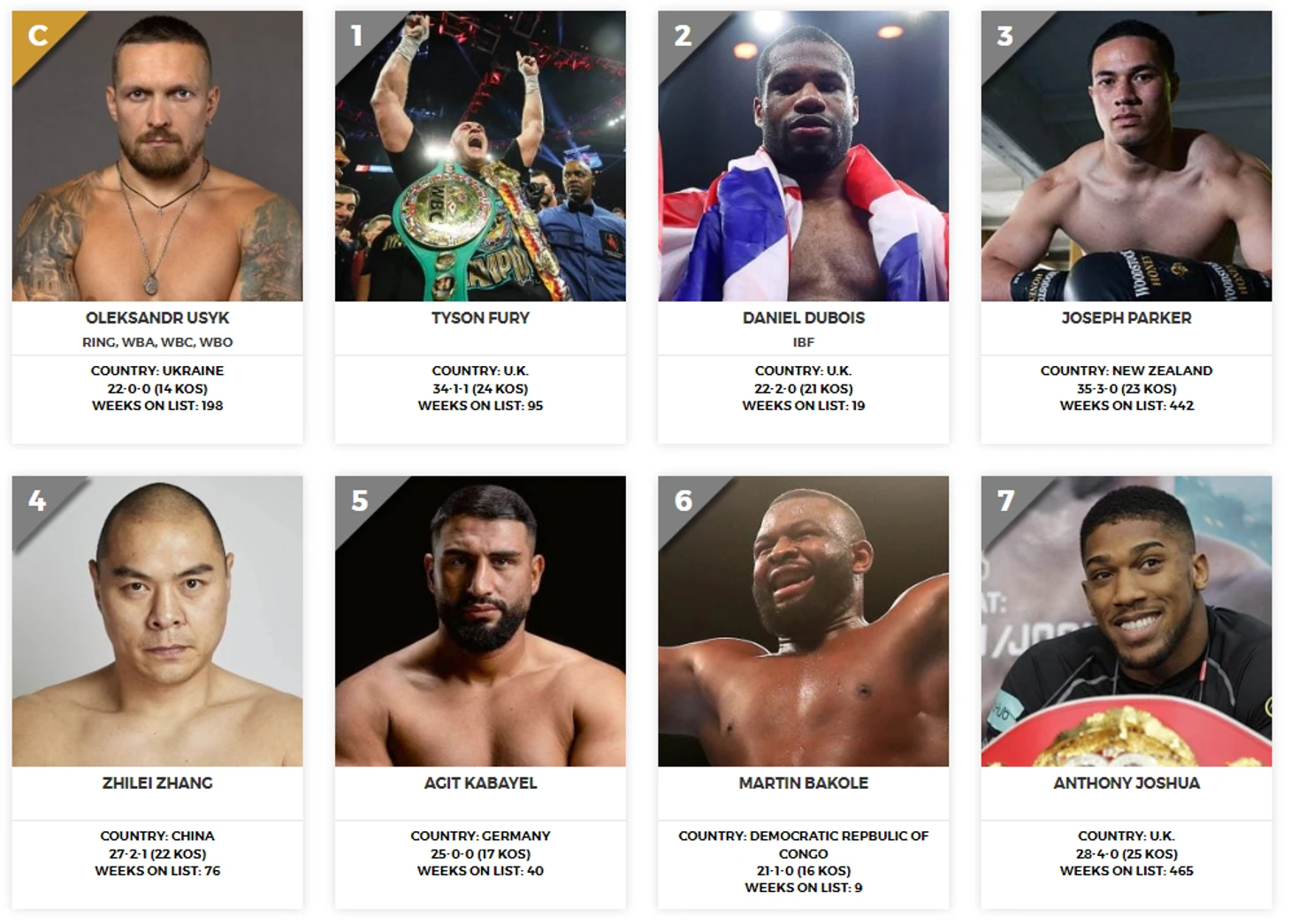 Александр Усик остается на чемпионской позиции с непобежденным рекордом 22-0-0. Вслед за ним идет Тайсон Фьюри и Даниэл Дюбуа, а закрывает тройку Джозеф Паркер.
