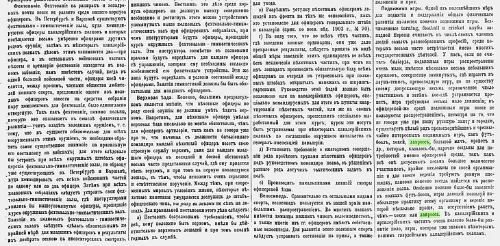 В офицерской же среде подвижные игры вовсе не пользуются распространением, несмотря на то, что не говоря уже про нашу русскую лапту и городки, существует целый ряд превосходнейших чрезвычайно интересных подвижных игр, как футбол, хоккей, лакросс, большой мяч, крокет и др., которые, казалось бы, нарочно созданы для потребностей именно офицерской среды, так как все они допускают весьма большое количество участников, крайне несложны по своей организации и для своего ведения требуют ровную площадку, каковая конечно всегда найдётся в расположении полка. Особенно полезно было бы заведение в полках футбола, игры дающей пожалуй наибольшую практику всему организму и ведение которой несколько проще, за отсутствием ракет, чем — хоккея или лакросса. В кавалерийских и артиллерийских частях очень полезно было бы развитие поло, игры, которая уже знакома некоторым нашим гвардейским кавалерийским полкам.