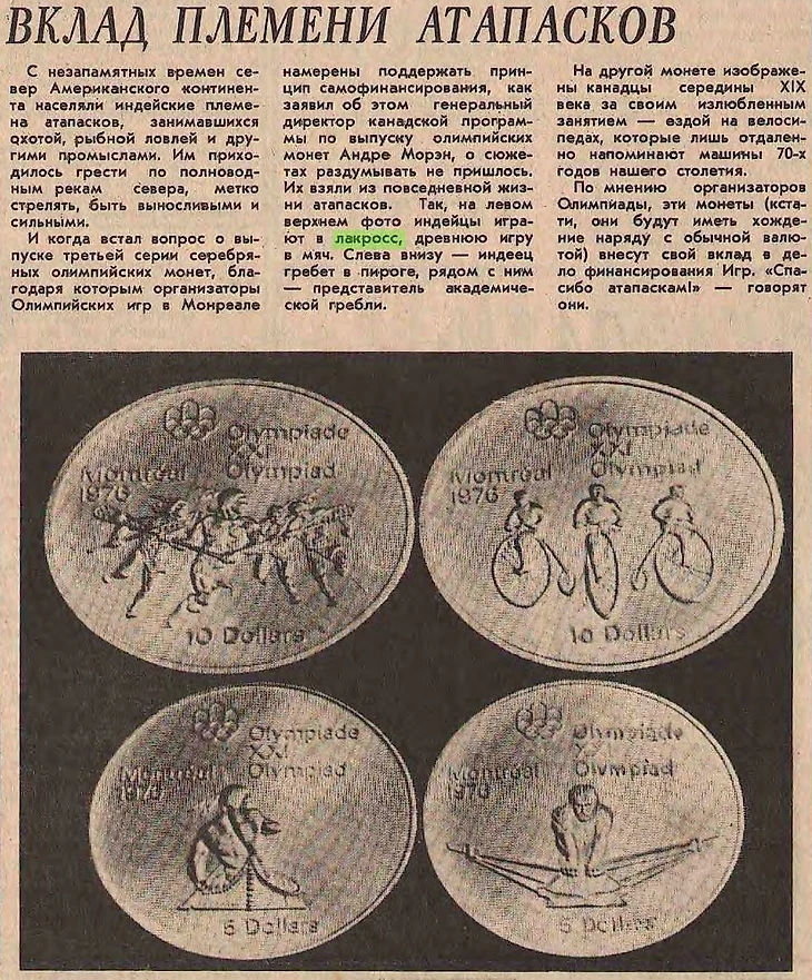 И когда встал вопрос о выпуске третьей серии серебряных олимпийских монет, благодаря которым организаторы Олимпийских игр в Монреале намерены поддержать принцип самофинансирования, как заявил об этом генеральный директор канадской программы по выпуску олимпийских монет Андре Морэн, о сюжетах раздумывать не пришлось. Их взяли из повседневной жизни атапасков. Так, на левом верхнем фото индейцы играют в лакросс, древнюю игру в мяч. Слева внизу — индеец гребёт в пироге, рядом с ним представитель академической гребли.