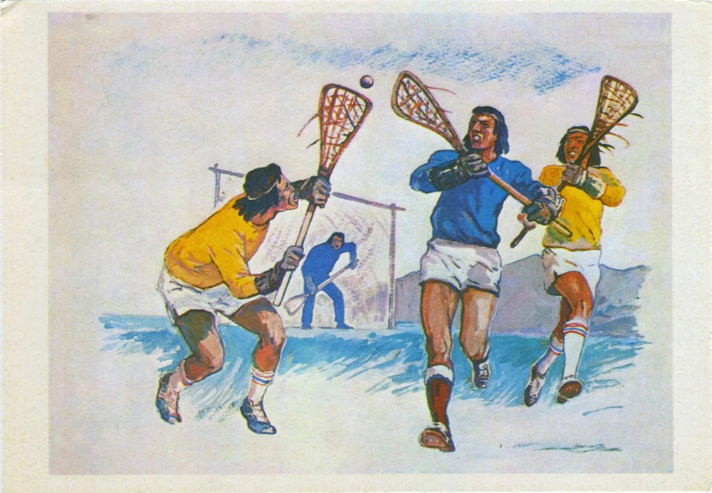Набор открыток «Спортивные игры и состязания народов мира», 1981 г. В наборе 24 открытки, и под №22 можно обнаружить лакросс. На барахолках коллекцию можно найти за 100-200 рублей.