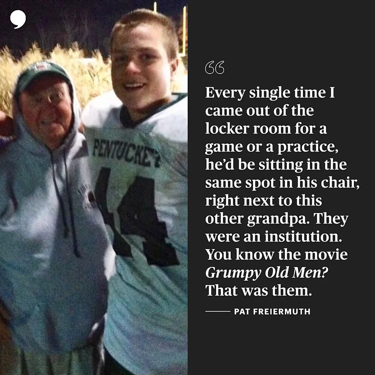 Ему бы это понравилось. Все это. Мой дед, он был для меня родственной душой. Он возил меня повсюду. Баскетбол, бейсбол, футбол, тренировки. Я родом из пригорода Бостона. Это очень похоже на Питтсбург. Когда наступает осень и листья начинают меняться, а в воздухе начинает пахнуть футболом, это лучшее чувство в мире, верно? Тот первый прохладный день. Friday Night Lights. Даже трава пахнет по-другому. Я могу прямо сейчас закрыть глаза и оказаться в дедушкином Крайслере со старыми кожаными сиденьями и опущенными стеклами. Фрэнк Синатра играет из динамиков, я еду на тренировку. Это чувство бесценно. Мои родители были и учителями, и тренерами, поэтому осенью они были очень заняты. Все эти поездки выпадали на долю моего деда, и он никогда не жаловался. На самом деле ему это нравилось. В багажнике его машины стояло старый зеленый стул, похожий на те, что продаются в Walmart. Должно быть, он был сделан в 80-х. Вы знаете, о чем я говорю. Стул для пикников. Металлический каркас. Чертовски неудобный, но почему-то он считал его идеальным. «Дедушка, мы купим тебе хороший стул». «Зачем мне еще один стул? Мне нравится мой стул». (Вы знаете такого парня. Все в Бостоне знают этого парня. И все в Питтсбурге тоже.) Каждый раз, когда я выходил из раздевалки на игру или тренировку, он сидел на одном и том же месте на своем стуле, рядом с другим дедушкой. Они были авторитетами. Помните фильм Ворчливые старики? Это были они. Сидели там в своих зимних шапках, смотрели тренировку, расслаблялись. Когда я заканчивал школу, мы подарили им картину из этого фильма в рамке. Самое смешное, что мой брат старше меня на четыре года и тоже играл в футбол. Так что мой дедушка закончил школу с одним Фрайермутом, а потом еще четыре года провел с другим Фрайермутом. Наверное, он посмотрел 100 игр и 700 тренировок с этого стула. Однажды на Рождество нам наконец надоело. Мы купили ему шикарный стул. Кажется, он был обит тканью, в нем был подстаканник и все такое. Он его ненавидел. «Мне не нравится угол наклона». Он вернулся к своему старому стулу. Он сказал, что тот «сломан».