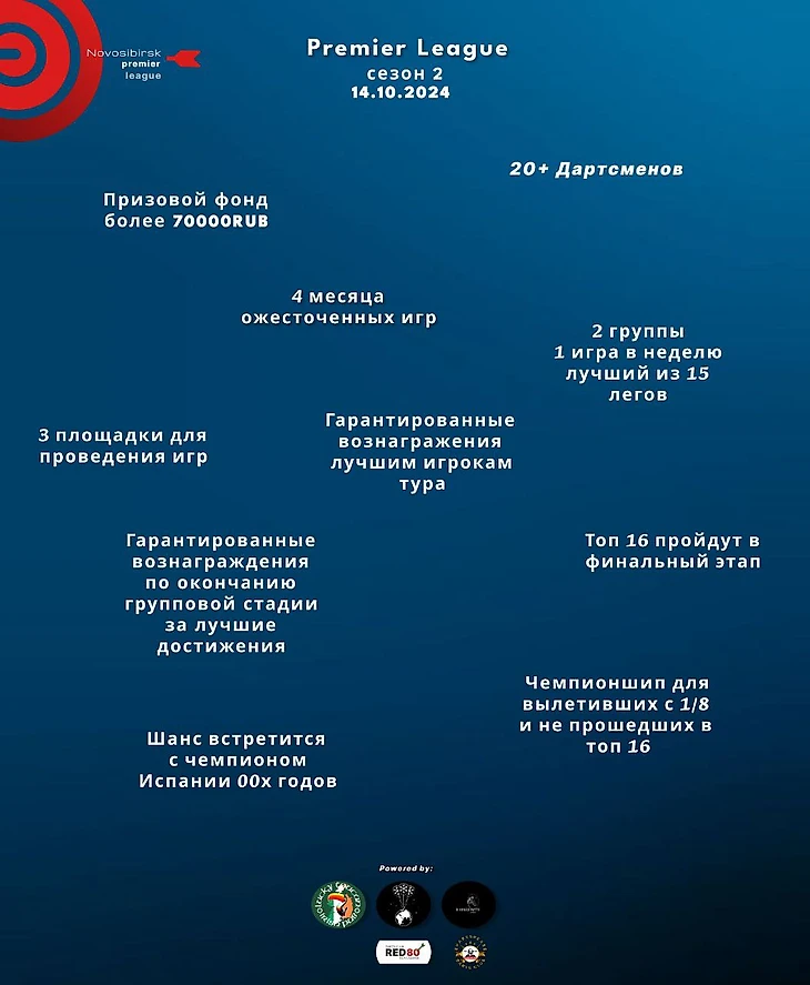 14 октября официально дан старт новому сезону Новосибирской дартс Премьер-лиги. Хотя хронологически Лига заходит уже на второй цикл (первый завершился яркой победой Владислава Коржавина), именно новый будет официально признан Первым сезоном НДПЛ, а предыдущий остаётся в истории как своеобразный «подготовительный этап». Это позволило организаторам учесть все возникшие в ходе экспериментального сезона сложности, а участникам привыкнуть к формату игр и навыкам коммуникации для организации встреч в «плавающем» графике туров. Афиша турнира: