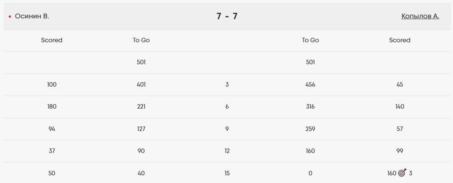 Первый лег ушёл на продолжение разминки в «игровых условиях»: набор в подходах у обоих игроков «гулял» довольно сильно - всего один на 100+, а именно 125 у Виталия. Он же первым вышел на удвоение, причём одно из классических - «дабл» шестнадцати. Но шести дротиков не хватило на закрытие, а Анатолий, дважды набрав 61, оставил себе на завершение 35 очков и закрыл их двумя дротиками.