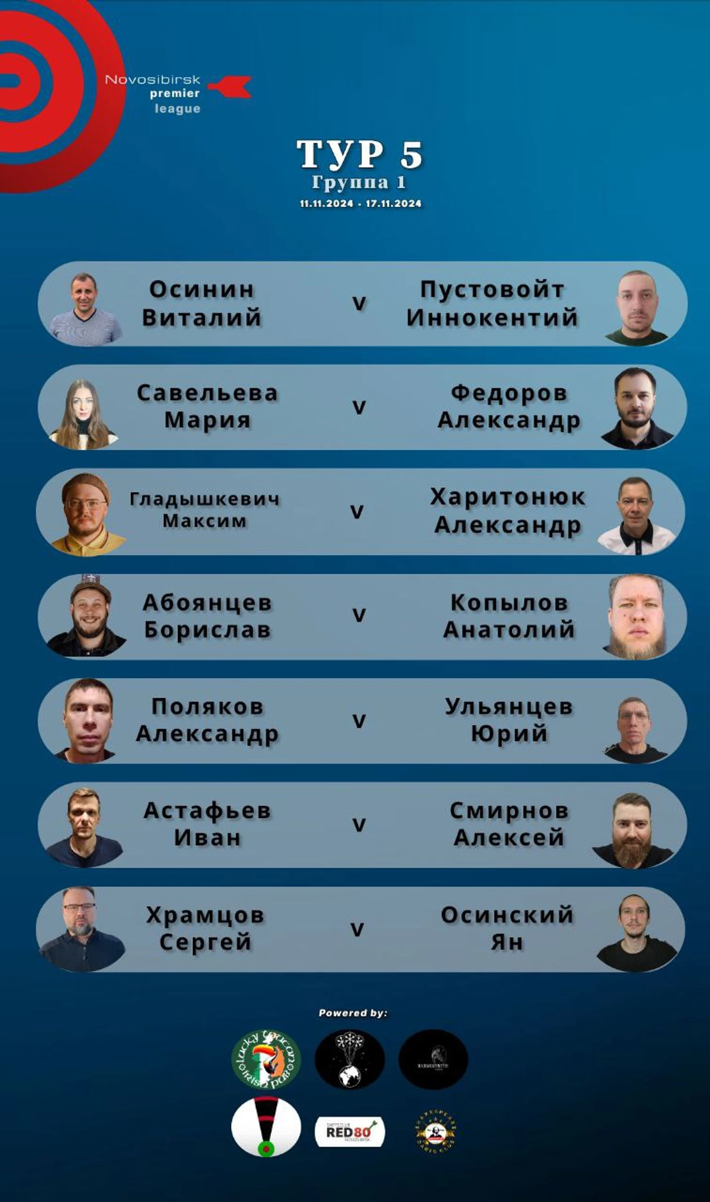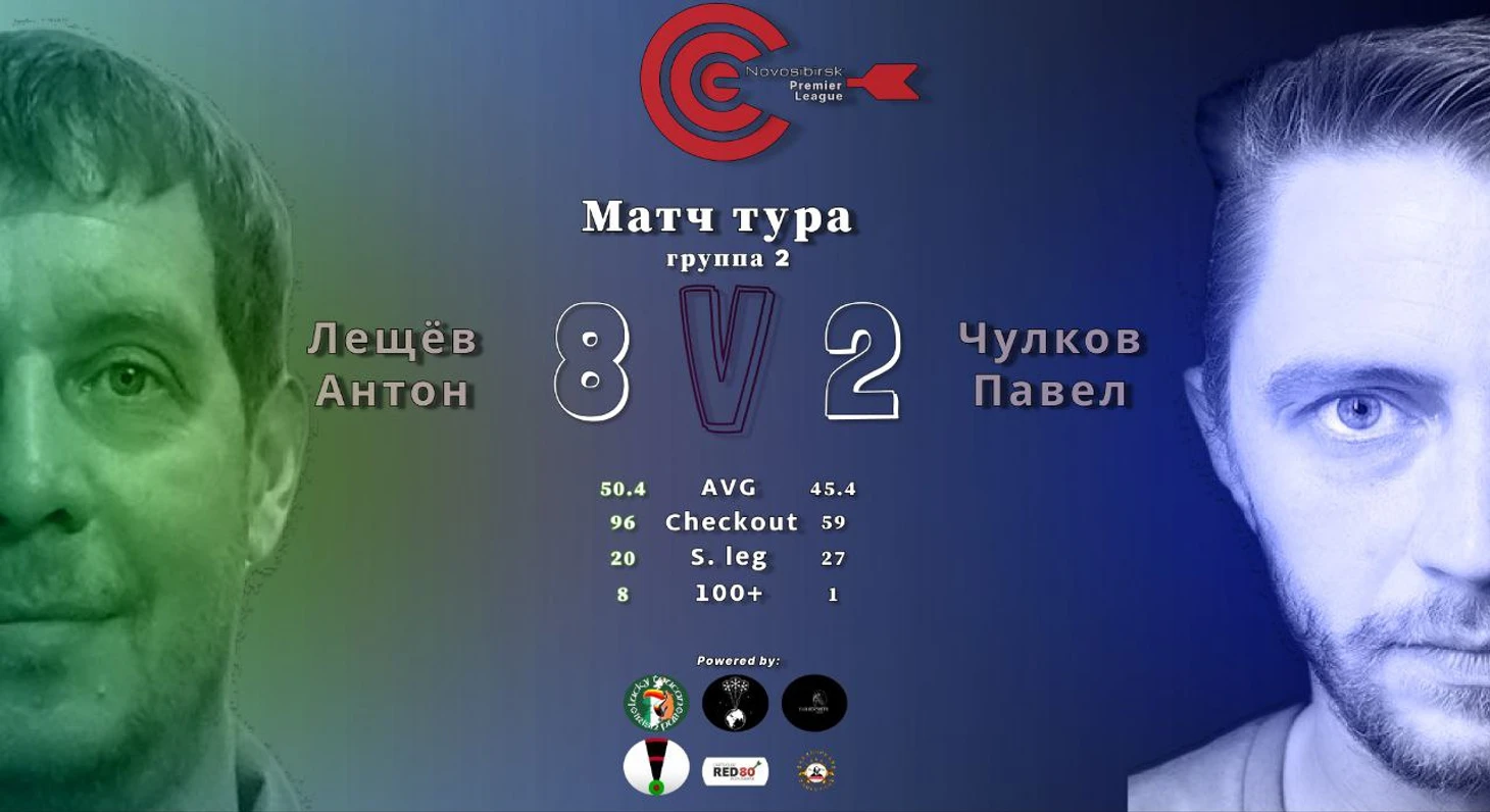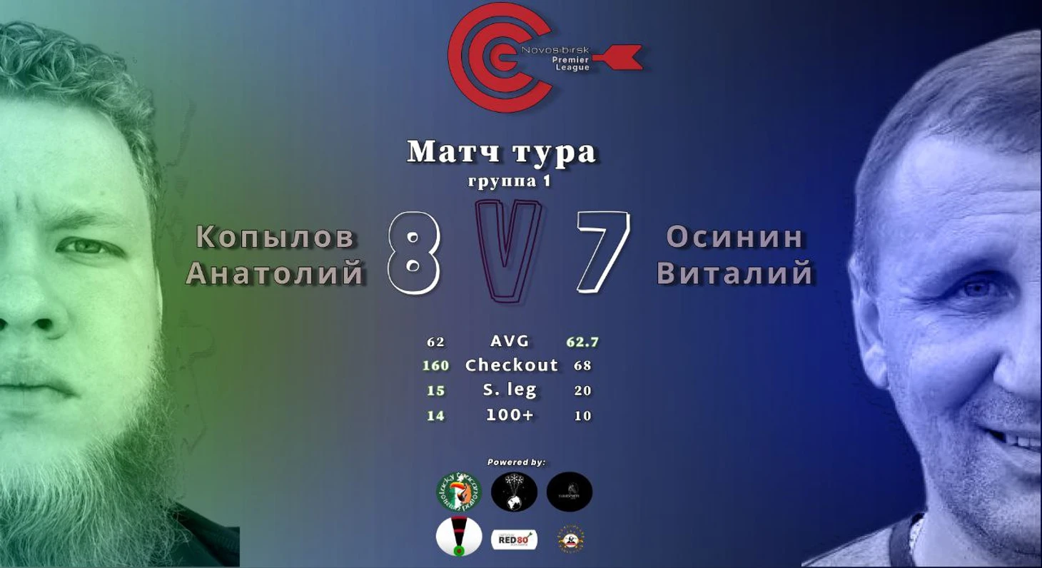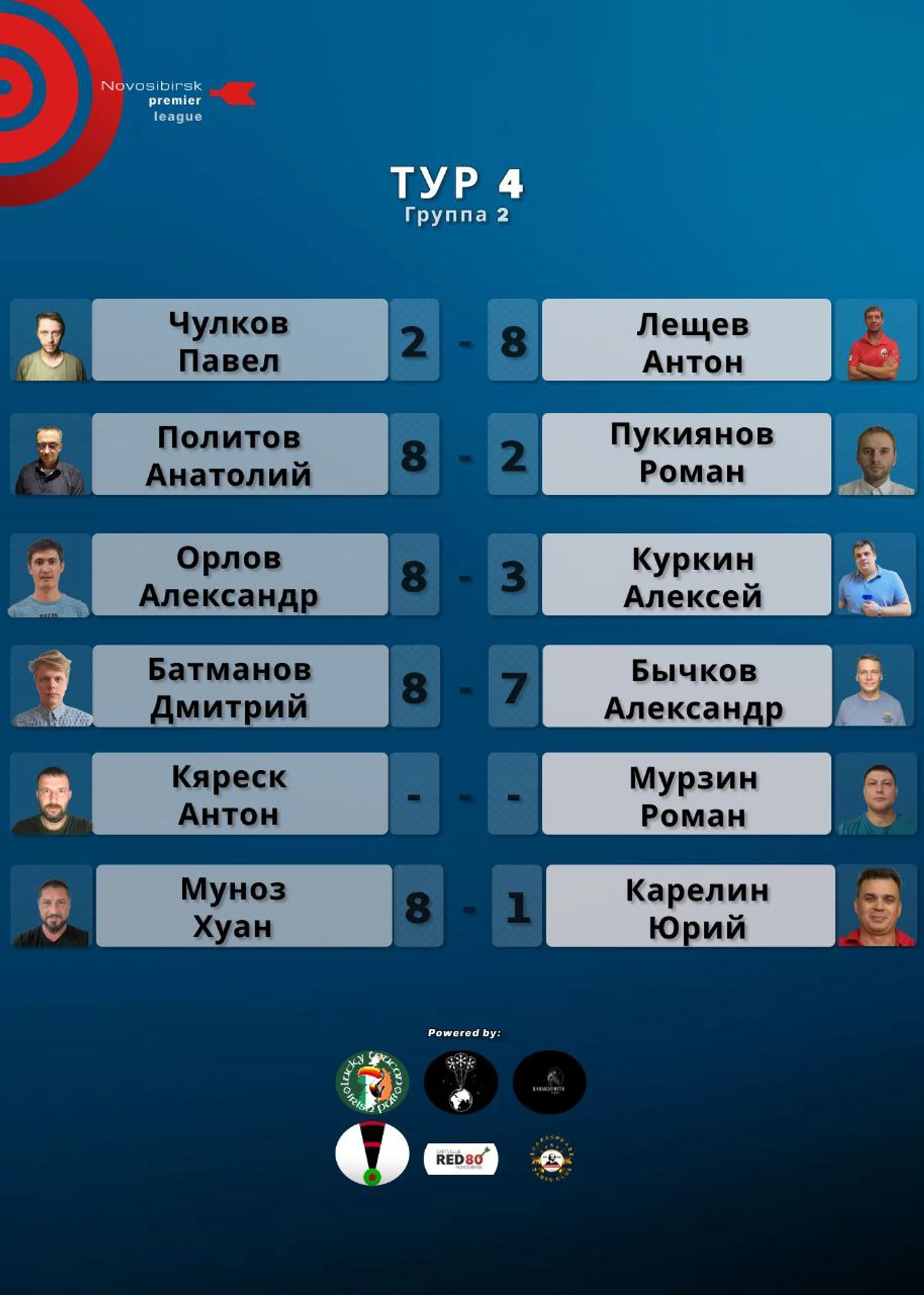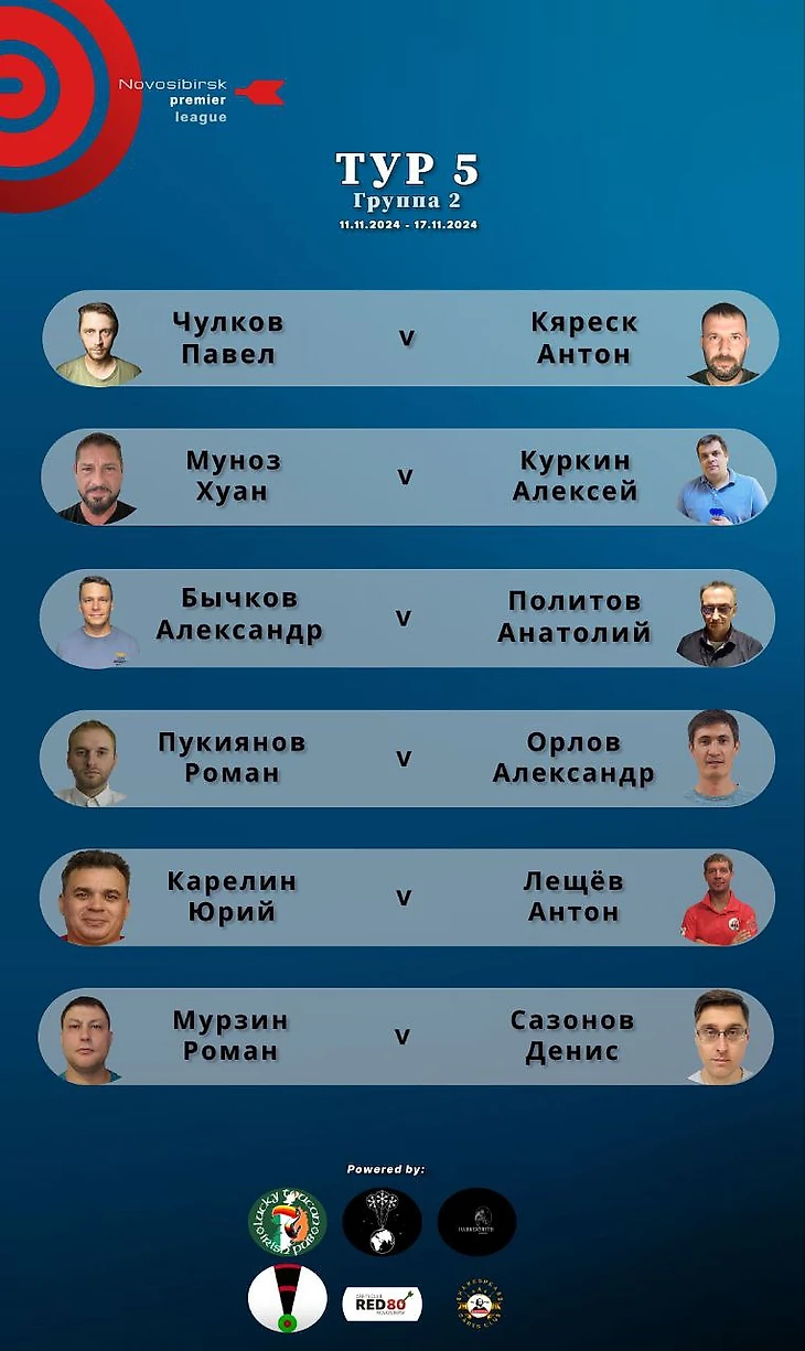Матч тура Юрий Карелин против Антона Лещёва Классическое противостояние для новосибирского дартса. У игроков было очень много очных встреч, но в данном турнире Антон идёт в группе лидеров, а Юрий замыкает турнирную таблицу, хоть и показывал пару хороших матчей в Премьер-Лиге. Надеемся, игроки устроят красивое дерби с «десайдером». Павел Чулков против Антона Кяреска Непредсказуемый матч - оба игрока сейчас не в лучшей своей форме и результат может быть любым. Хуан Муноз против Алексея Куркина Пожелаем удачи Алексею выстоять под градом действий в 100+ очков от Хуана - в среднем за игру у него их 15. Но могут подвести «даблы», как и всех нас. Александр Бычков против Анатолия Политова Анатолию нужно сыграть с набором больше 52 и тогда у него будет очень большой шанс на победу. Александр в последнее время показывает стабильную игру и все чаще закрывает 100+. Роман Пукиянов против Александра Орлова Роману предстоит тяжелый матч, но и Александр сейчас, с его слов, играет ниже своих способностей. Роман Мурзин против Дениса Сазонова Роман осваивает новую технику и результаты в других турнирах уже становятся всё лучше, нужно выбираться с подвала таблицы. Денис играет ровно и мешают только закрытия, надеемся, он проработал их и покажет хороший матч.