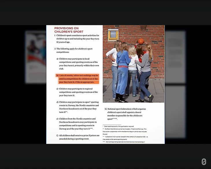 Успех Норвегии — результат плана. Плана под названием «Права детей в спорте», принятого Национальным олимпийским комитетом в 2007 году. Это документ, не похожий ни на один другой в мире. На восьми страницах описывается тип опыта, который должен быть предоставлен каждому ребенку в Норвегии. В основе: видение «idrettsglede». Что буквально означает «радость спорта».