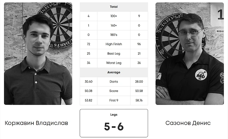Уже на следующем этапе турнира - в четвертьфиналах результаты оказались значительно более «плотными». Только в одном из них Александр Бычков с хорошим набором средним набором в 52,0 очка преодолел сопротивление Александра Харитонюка с ощутимым отрывом - 6:1. А вот дальше начались «матчи-триллеры». Встреча Дмитрия Плужникова и Владислава Коржавина при ином посеве с большой вероятностью состоялась бы в финале, но так случилось что Владислав «шёл» по сетке со всего лишь восьмым посевом, а это предполагает встречу с лидером рейтинга уже в четвертьфинале. В итоге оба дартсмена сыграли лучший по среднему набору матч турнира - на 55,09 от Дмитрия Владислав ответил ещё более уверенными 58,49! Дмитрий сильно сыграл в дебюте матча и повёл со счётом 2:0 по легам, удерживая преимущество и инициативу вплоть до счёта 4:1. Но на этом критическом для итога встречи моменте Владислав резко «включился» и начал повторять один за другим подходы на 80+ очков (в том числе 135 и 140) и не тратя лишних дротиков на закрытия. Лег за легом от сначала сокращал отставание, а поле счёта 4:4 сначала забрал девятый лег за 23 дротика и решающий десятый за 20, оба раза без видимых проблем «раскладывая» нечётные остатки двумя дротиками. Настрой на матчи-погони поддержали в своём четвертьфинале Денис Сазонов и Павел Чулков. Не так давно они уже встречались в рамках Премьер-Лиги и тогда Павел упустил огромное преимущество по легам и позволил Денису сравнять счёт и вырвать победу. На этот раз отрыв более одного лега никто из соперников не смог сделать вообще ни разу. Павел раз за разом забирал леги с мощными подходами: лег с серией 100-140-100 очков, за ними 180, потом 100-121-81. Денис оставлял за собой «длинные» леги, когда соперники «застревали» на удвоениях. В итоге - счёт 5:5 и решающий лег для выявления победителя. Начинал его Денис и это, по большому счёту, и предрешило исход: когда у игроков оставалось меньше 200 очков, Денис сделал подход на 100 и закрыл остаток в 41 очко тремя дротикам, когда Павел уже был готов закрывать свой «топс». Ну и в последнем четвертьфинале Василий Чумаков и Александр Березовой решили поддержать заданный тренд и тоже довели дело до «десайдера». Правда, сценарий матча был другим: Василий забрал первый лег, на что Александр ответил своими сразу тремя победными, в каждом из которых он делал минимум один подход на 100 очков и добавил к ним 180. Василий, в свою очередь, в пятом леге «закинул» два по 100 и сократил отставание по легам до 2:3. Шестой лег оказался «затяжным» и победу в нём «выстрадал» Александр, после чего Василий сразу же вернул свои лучшие настройки и оставил за собой седьмой, с подходом на 140 очков. Хорошо лидировал он и в следующем, но Александр, имея о остатке 133 очка, сначала уверенно «закинул» 129, а потом с одного дротика «закрыл» остаток 4 очка. В ситуации когда отступать было некуда, Василий дважды совсем немного опережал соперника в девятом и десятом легах. доведя счёт до равного - 5:5. «Десайдер» в итоге превратился в «борьбу на выживание»: Василий угодил в самый, пожалуй, неудобный остаток в 3 очка, а Александр упорно «стоял» на удвоении пяти. Шесть подходов подряд соперники испытывали свои нервы и зрителей на прочность, пока в итоге удача не улыбнулась Александру - его 53-й дротик наконец вонзился в «дабл» пяти и вывел его в полуфинал.