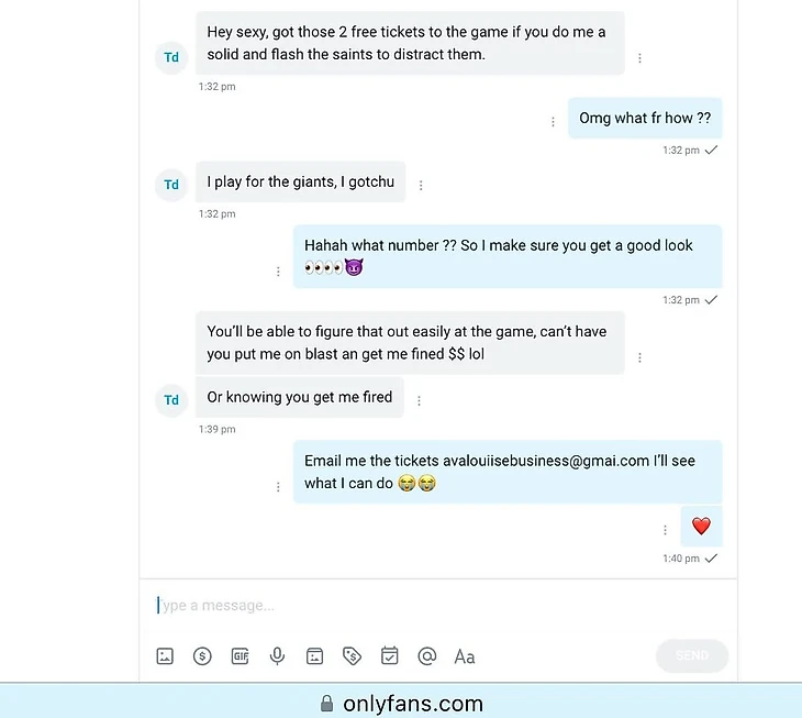 Ава Луиза поделилась сообщениями от неназванного игрока «Нью-Йорк Джайентс», который предлагал ей два бесплатных билета, если она «отвлечет внимание» «Нью-Орлеанских святых» в воскресенье на стадионе «МетЛайф».