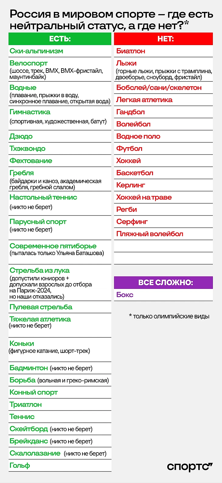 По скейтбордингу, брейкингу и скалолазанию сведения расходятся. Решение по допуску в нейтральном статусе было, но наша сторона этим не пользуется – то ли принципиально, то ли слишком много сложностей/требований.
