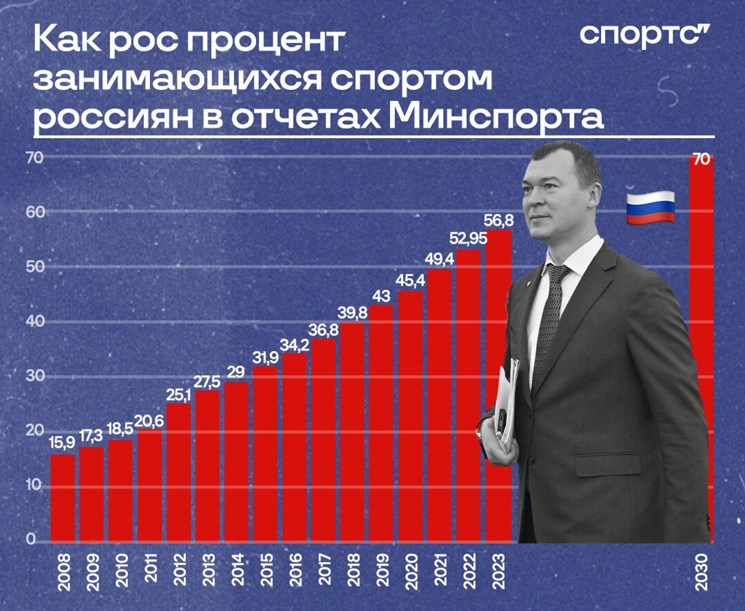 «На сегодня, по нашим подсчетам, уже около 60% занимаются активно спортом. Оставшиеся 11% доберем вместе. Абсолютно реально достичь показателя 70%, если мы будем вместе – регионы, правительство России, федерации по видам спорта, мы абсолютно убеждены, что будет достигнут этот показатель. Я думаю, что даже перевыполнен», – октябрьские обещания от нового министра Михаила Дегтярева.