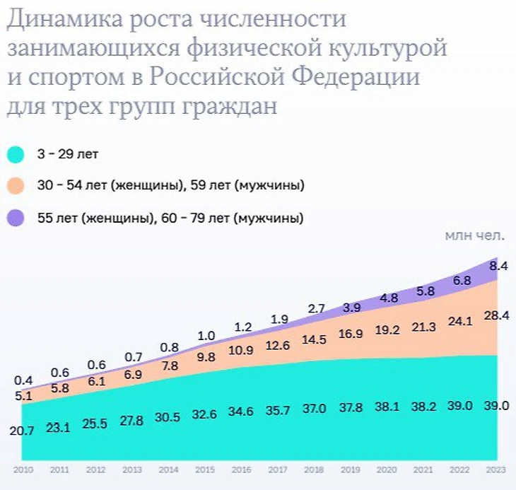Противоречит данным Минспорта и исследование проведенное АНО «Национальные приоритеты», согласно которому доля населения, регулярно занимающегося спортом, составляла 30% и оставалась стабильной с 2020-го по 2023-й.