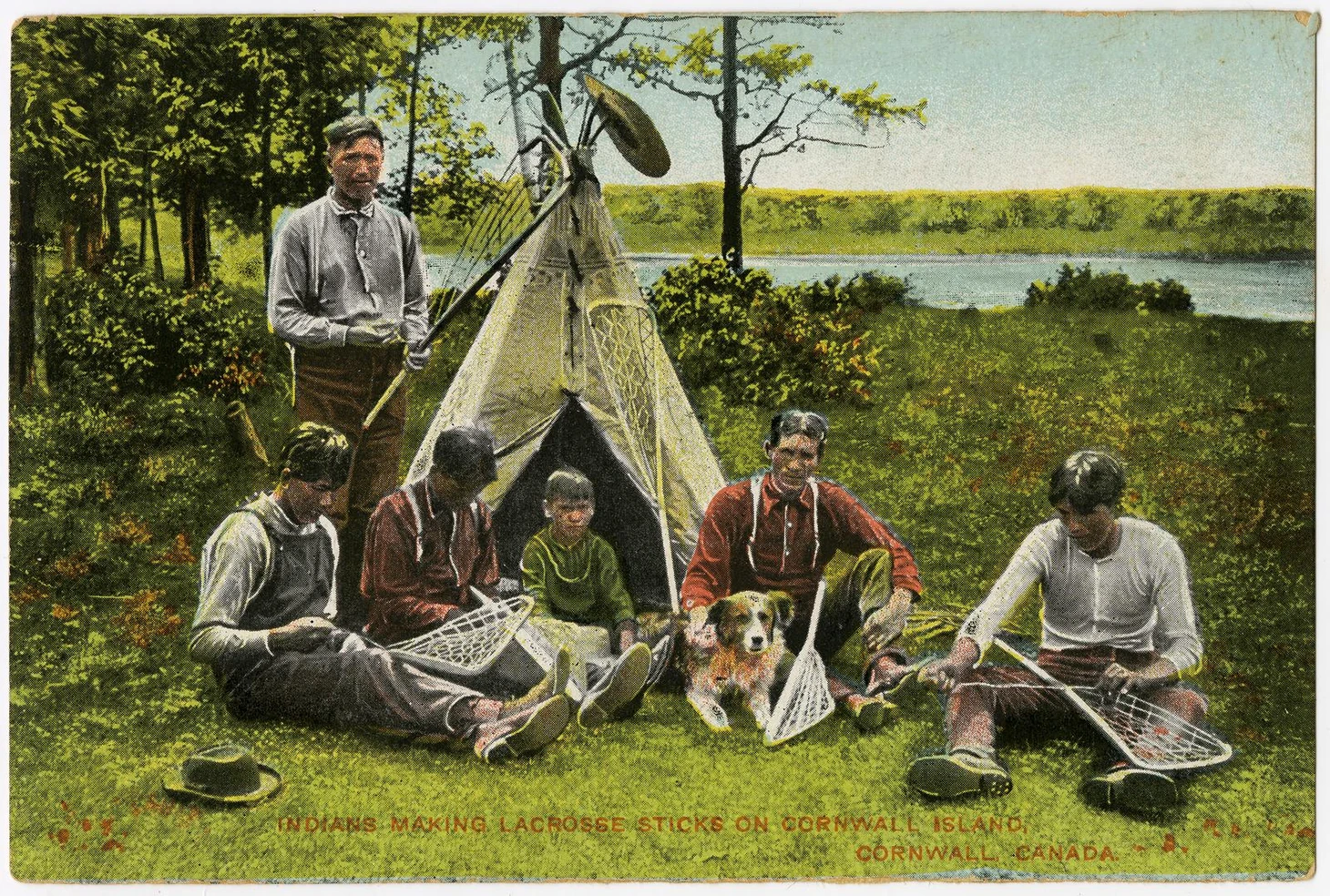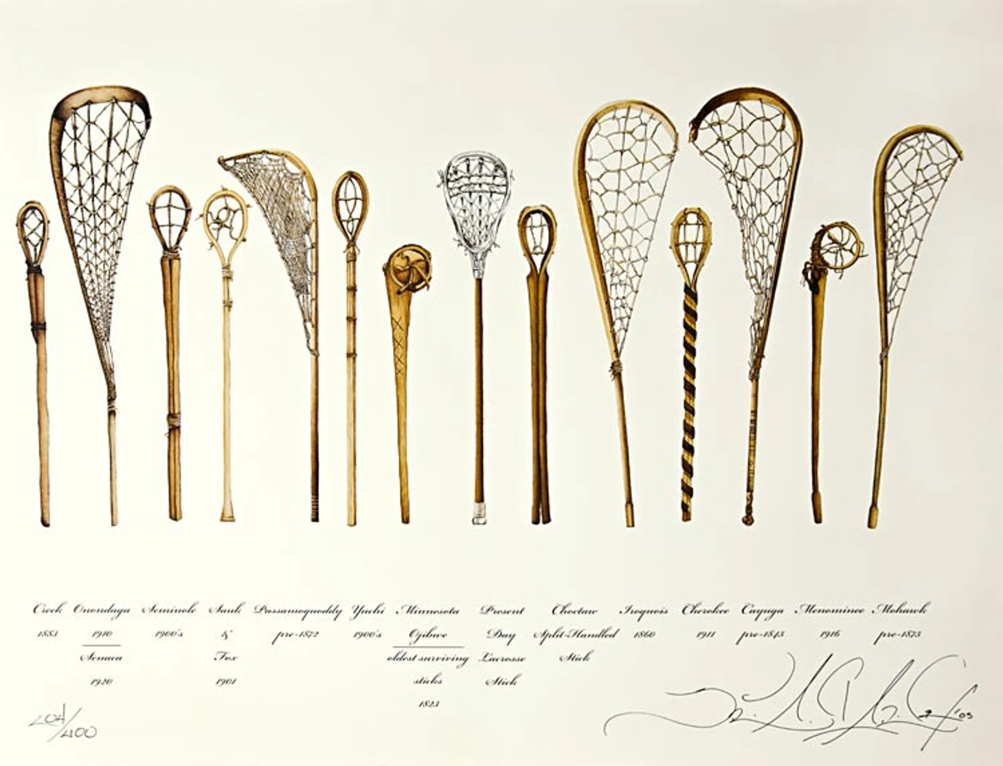 «Мужчины вкладывали много труда в тщательно подготовленные снегоступы, снежные змеи, копья, дротики, клюшки для лакросса, бирки и другие предметы, используемые в играх. <…> В лакросс играли американские индейцы за несколько столетий до открытия Америки. Он был описан французским торговцем в 1662-1669 годах и миссионером еще раньше. В древние времена использовался деревянный мяч, сделанный из капа или сучка дерева. Позже в обиход вошел небольшой мяч из оленьей кожи, плотно набитый мхом или волосами и зашитый сухожилиями. Первоначальная бита имела твердую изогнутую голову. Позже появилась ракетка с изогнутым концом, через который была натянута сетка из сухожилий или ремней из оленьей кожи до точки, расположенной высоко на ручке. Эти ракетки иногда украшались резьбой».