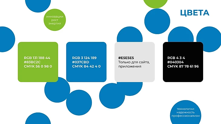 Цвета играют важную роль в нашем новом фирменном стиле. Мы выбрали голубой и ярко-салатовый цвета, чтобы выразить ключевые ценности нашего бренда.