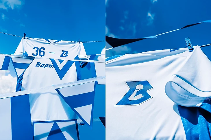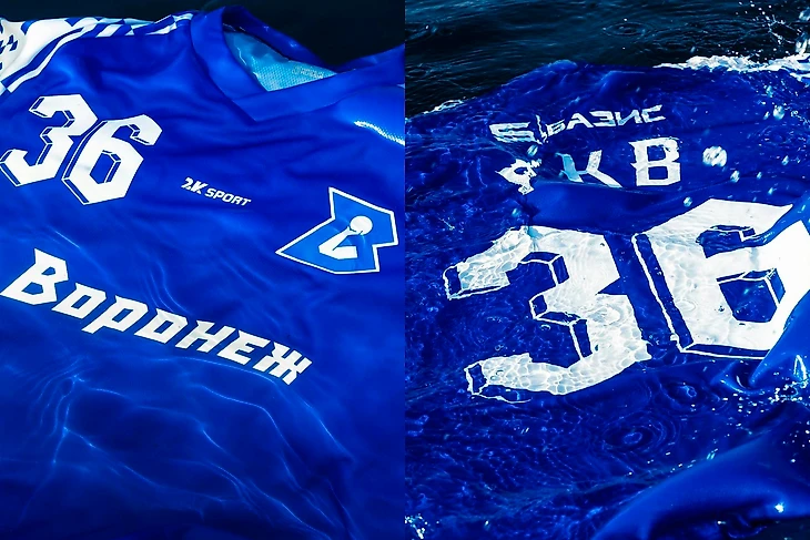 Второй комплект вышел в люди перед самым стартом Суперлиги. Продолжили придерживаться минимализма, сочетая его с фирменным стилем. Теперь без флажков, но с узнаваемым паттерном: на белых плечах расположили ломанные синие волны. Цифры на форме получили объемный эффект, который оценили любители ретро. Леттеринг «Воронеж» и рельефная эмблема остались на месте.