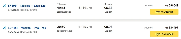 Из Новосибирска добраться до Улан-Удэ по воздуху можно два раза в сутки. Рейсы выполняет авиакомпания S7 Airlines в 02:15 и 23:50. Время в полете в обоих случаях занимает два с половиной часа, но стоимость билетов существенно разнится. На ночной рейс от 13 943 рублей, на вечерний – от 24 633 рублей.
