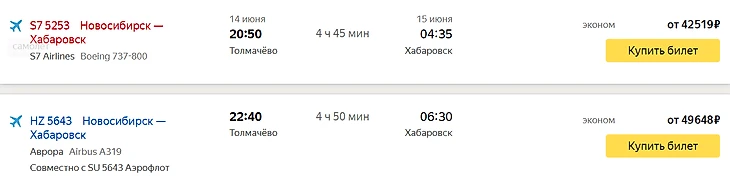 Из Новосибирска долететь до Хабаровска можно тремя ежедневными рейсами: в 20:50 и 23:30 авиакомпании S7 Airlines, в 22:40 авиакомпании «Аврора» совместно с «Аэрофлотом». Правда, билеты эконом-класса стоят существенно дороже, чем из Москвы, – от 42 519 рублей.