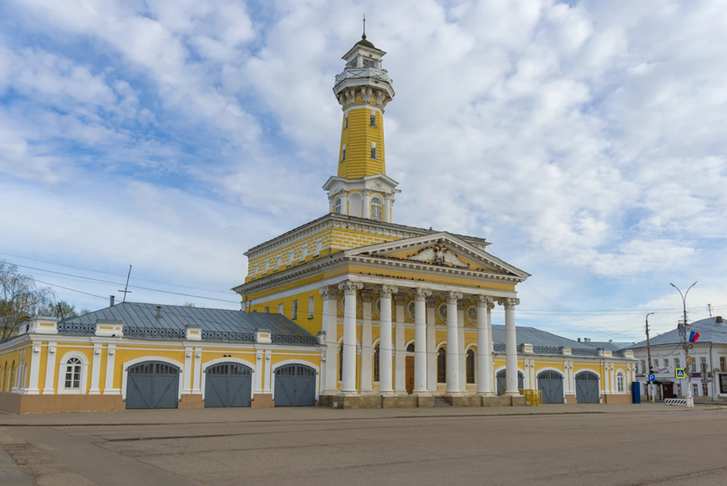 Пожарная каланча обычно изображается на марках, открытках. Она считается визитной карточкой областного центра и одной из главных достопримечательностей Костромы. Здание было построено в первой половине XIX столетия по проекту архитектора Петра Ивановича Фурсова. Каланча стала одной из самых передовых своего времени. Города практически полностью состояли из деревянных построек, часто возникали пожары. В итоге вышел царский указ о возведении подобных участков. В башне всегда располагались дозорные, сообщали об очагах пожаров. Император Николай Первый во время визита в Кострому особо отметил строение, сказав, что в столице не существует такого же по красоте сооружения. Вплоть до 2005 года в здании располагалась пожарная охрана МЧС России. Сегодня каланча входит в городской архитектурно-исторический ансамбль и украшает центральную площадь. В нем находится экскурсионное бюро Костромского музея-заповедника.