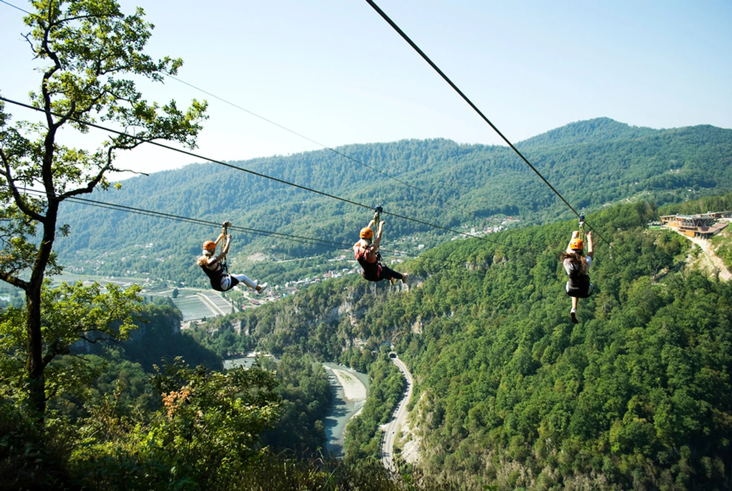 Туристы на аттракционе «Зиплайн» в Скайпарке, Сочи (2017 год) © Инна Грязнова / Фотобанк Лори