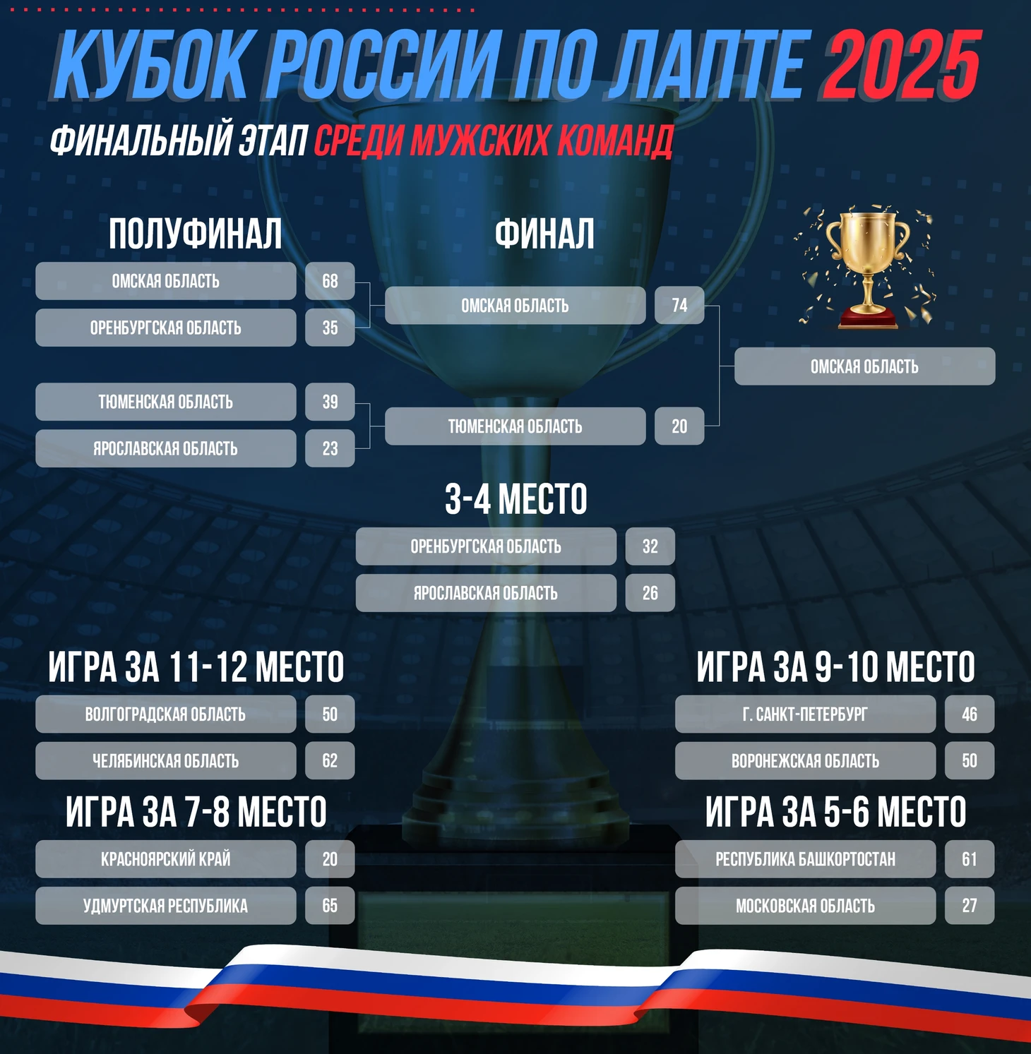 Мужская сборная Омской области показывает высочайший уровень стабильности и мастерства. Это пятое подряд золото Кубка России, при этом команда победила на двух прошлых чемпионатах страны, также ее представители без поражений проводят уже третий сезон в рамках Профессиональной лиги русской лапты.