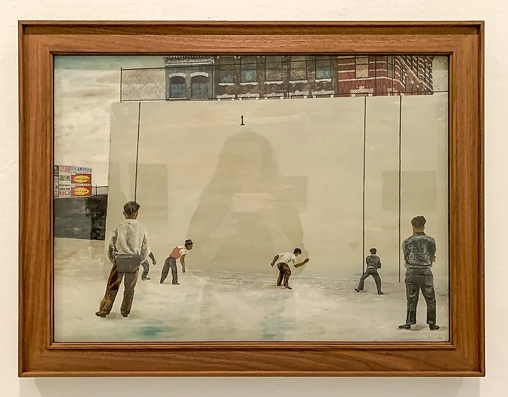 На картине изображена сцена уличного американского хендбола, популярного в США с начала XX века и особенно в 1920–1940-х годах. Это не командный гандбол, а народная игра — one-wall handball, в которую играют один на один или в парах, отбивая рукой небольшой резиновый мяч о стену. Он считался доступным и демократичным занятием для рабочего класса