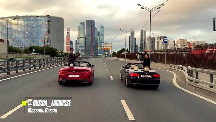 На первом видео недалеко от Москва-Сити представители мужской команды бросают друг другу мяч, находясь в рядом едущих кабриолетах. На втором — девушки с помощью клюшек имитируют академическую греблю. На третьем — игрок метким попаданием разбивает подброшенную в воздух тарелку.