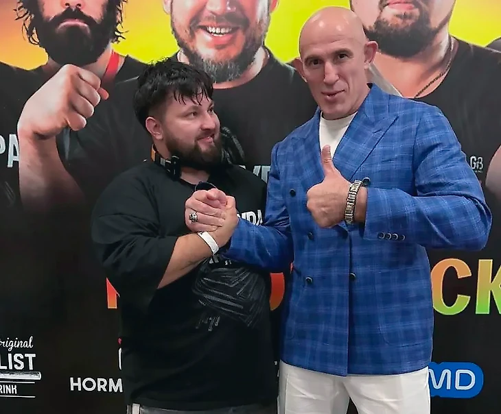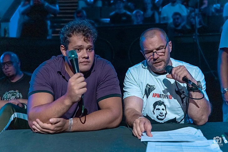 «Вот с тем здоровенным парнем должен был бороться я, представляешь!» — вполне возможно, именно об этом Алексей Ловчев сейчас рассказывает Амирану Сардарову, наблюдая за тем, как на сцену юбилейной АРМАТУРЫ поднимается Валерий Чуботару! Рекордсмен мира по тяжёлой атлетике должен был бороться с ним в соглавном бое юбилейной АРМАТУРЫ, но из-за травмы был вынужден сняться с боя.