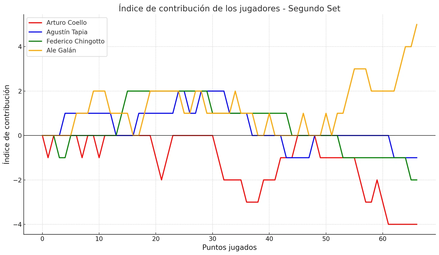 Перелом в первом сете и победа в тай-брейке дали мощный эмоциональный импульс претендентам. Во втором сете выяснилось, что главное оружие Артуро Коэльо — мощнейший смэш с задней линии — перестало работать. Мячи возвращались в зону сетки, где Але Галан без труда выбивал их за пределы корта. Заметив это, пара переключилась на Артуро и обрушила максимальное давление уже на него.