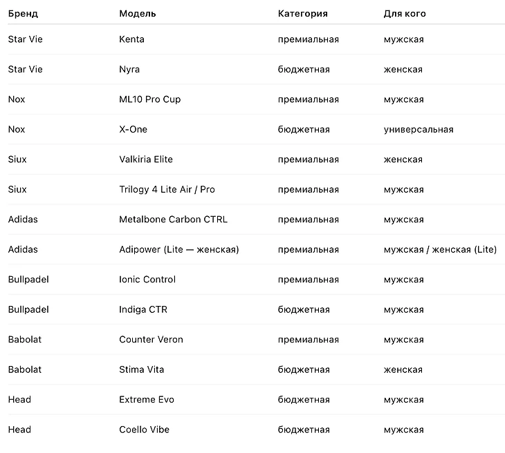 Не стоит брать совсем неизвестные марки, у которых и сайта собственного нет, так можно попасть просто на некачественный товар. Но если это ракетки от компаний Bullpadel, Nox, Adidas, Head, Wilson, Siux, Star Vie, Babolat – не сомневайтесь, в ваших руках продукт высокого качества.