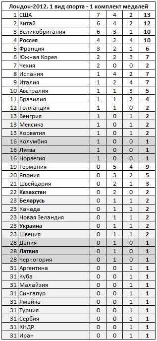 Лондон-2012. Альтернативный зачет. 1 вид спорта - 1 комплект медалей