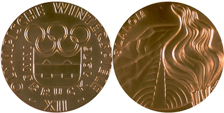 Над каждой из двух сторон медали работали разные дизайнеры. На лицевой стороне художница Марта Куфаль изобразила горы Торлауф. На оборотной стороне ее коллега Артур Цеглер соединил олимпийские кольца с эмблемой города и мостом через реку Инн.