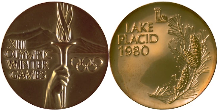 Лавровые венки здесь заменяет сосновая ветвь с шишками. Оборотную сторону украшают горы Адирондак, соединенные с эмблемой Олимпиады в единую композицию.