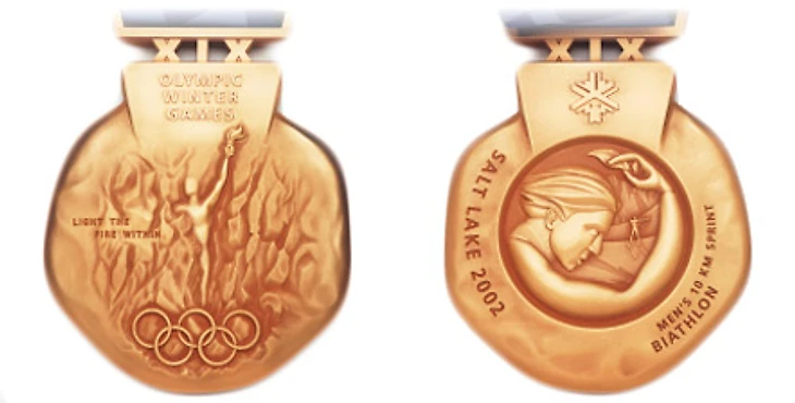 Одна из самых тяжелых медалей в истории Игр, не круглая, дизайн навеян формой скал в окрестностях Юты. На лицевой стороне – спортсмен прорывается сквозь снег. На оборотной стороне – богиня Ника смотрит на атлета-участника Олимпиады.