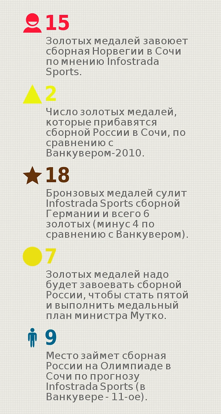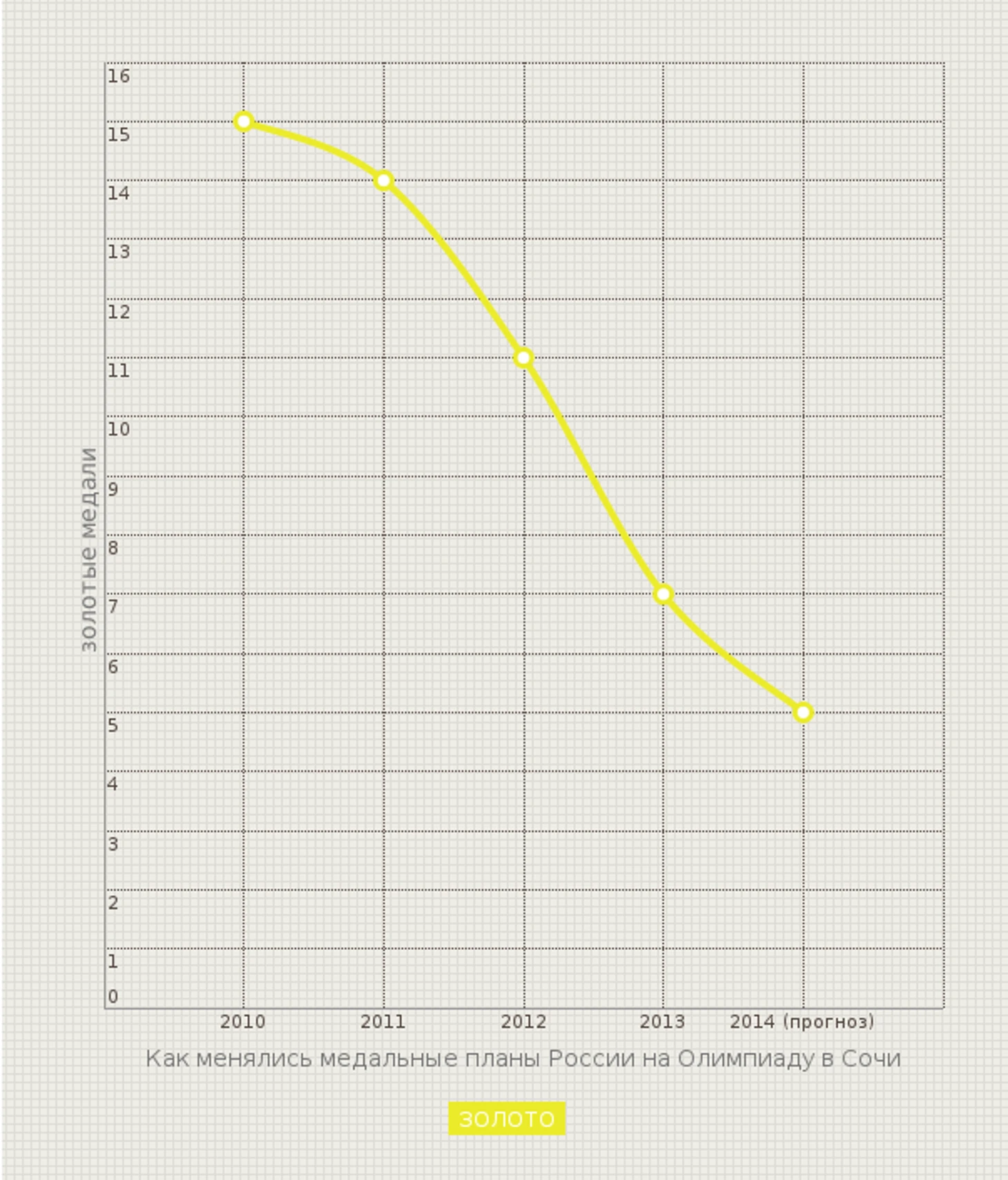 Тогда еще были свежи впечатления от Ванкувера, усидевший в своем кресле Мутко обязан был как-то перевести обсуждение с реальных поражений на будущие победы. С тех пор и будем вести учет изменениям в чиновничьих планах на медали в Сочи. В 2011 прогноз несколько скорректировали, цифра «14» стала мелькать в речах чиновников от спорта чаще, чем «15». В 2012 году после Лондона уже даже приблизительными цифрами не разбрасывались: