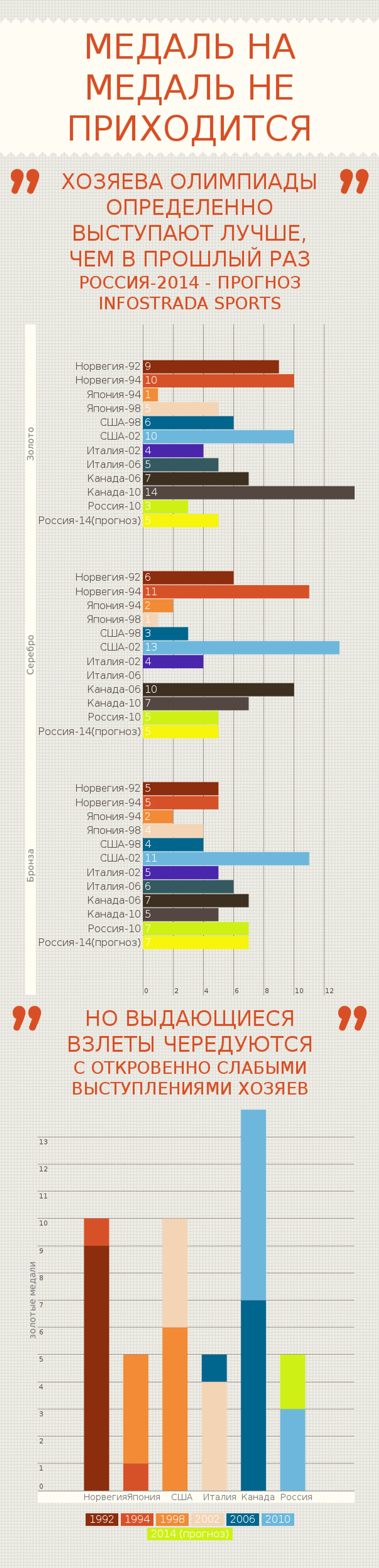 Опыт предыдущих хозяек Олимпиад за последние 20 лет говорит, что есть четкое чередование в количестве выигранного золота, 10-5-10-5. После «за десять» Канады-2010 России остается взять традиционную «пятерку» золотых и грустно взирать на успехи других. Впрочем, в 2018 году зимняя Олимпиада ведь будет в Южной Корее, от корейцев сложно ждать такой же традиционной десятки по золотым медалям (был бы это Китай, я бы еще посомневался), поэтому почему бы России в Сочи не начать новый цикл или хотя бы разрушить старый?