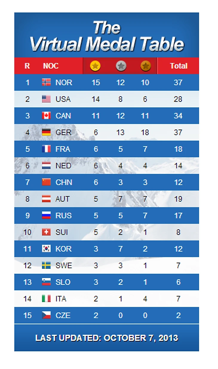 Второе место – у американцев (13-6-9). Третьи – немцы (9-7-10). Канада четвертая (7-12-10). Россия замкнула пятерку (7-5-11).