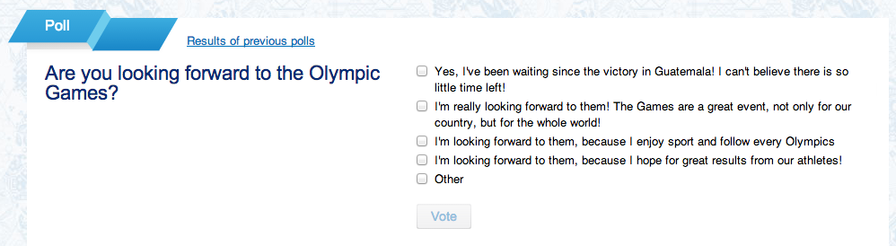 Редакция англоязычного сайта задала читателям вопрос: «Ждете ли вы начала Олимпийских Игр?». Выбрать предлагается из следующих вариантов ответов: «Да, с нетерпением жду еще с победы в Гватемале! Не могу поверить, что осталось так мало времени!»; «Очень жду! Игры — великое событие не только для нашей страны, но и для всего мира!»; «Жду, потому что увлекаюсь спортом и слежу за каждыми Олимпийскими Играми»; «Жду, потому что надеюсь на хорошие результаты наших спортсменов!»; «Другой вариант».