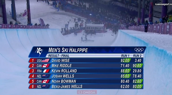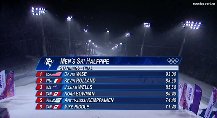 22.29 Все, золото в ски-хафпайпе получает Дэвид Уайз (США), серебро – Майкл Риддл (Канада), бронзу – Кевин Роллан (Франция)!