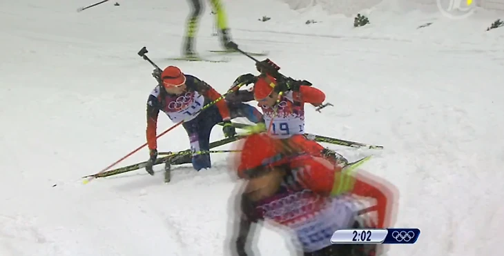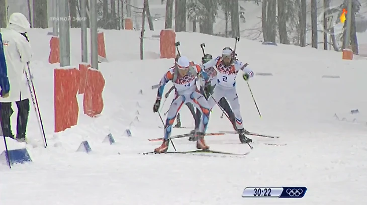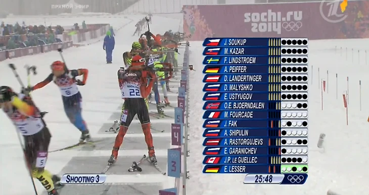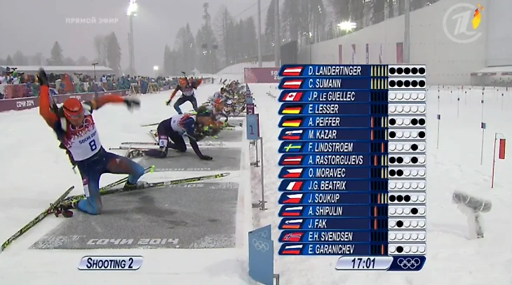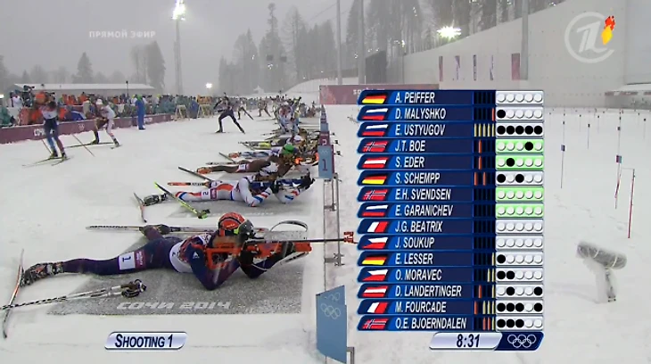 14.54 Без промаха Гараничев и Устюгов, так же и Свенсен. Мартен Фуркад мажет, Бьорндален – дважды! У Малышко один промах, он идет в одно время с упавшим Устюговым.