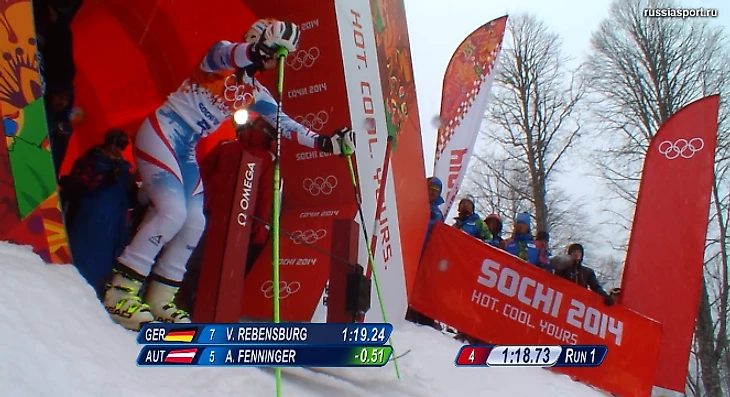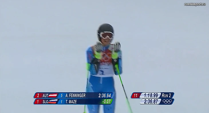 13.59 Отстояла свое приумещство Тина! Она – дважды олимпийская чемпионка Сочи! На 7 сотых она опережает другую чемпионку этих Игр – Анну Феннингер!