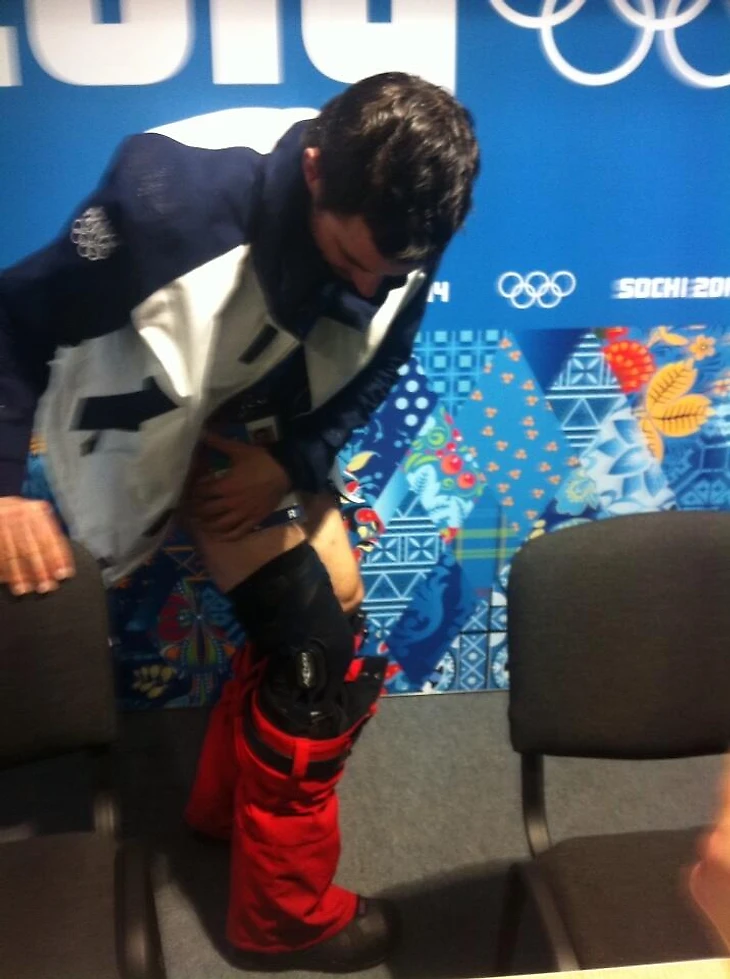 13.47 Олимпийский чемпион снял штаны на пресс-конференции. Зачем? Чтобы показать наколенник, который поддерживает недавно оперированное колено. После разрыва «крестов» Вольтье смог за два месяца вернуться на трассу и взять золото в Сочи: