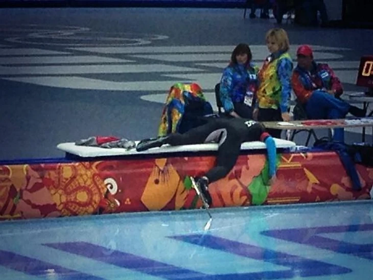18.53 У конькобежцев продолжаются марафонские забеги на 10 километров. Чтобы понять, как устают мужчины на этой дистанции, достаточно взглянуть на одну фотографию. После финиша сил хватает только на падение на мягкий мат.