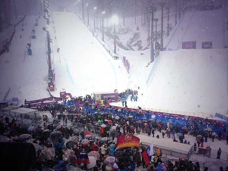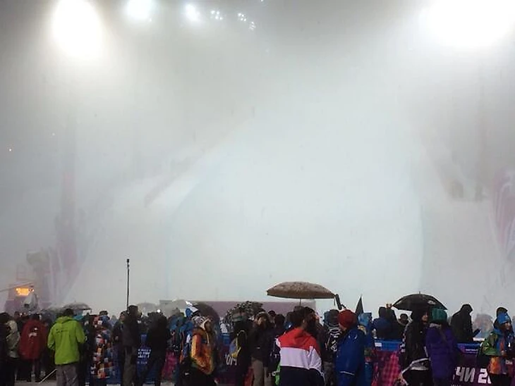 13.19 В горах сейчас дождь и мокрый снег, но об отмене соревнований в Сочи никто пока не говорит.