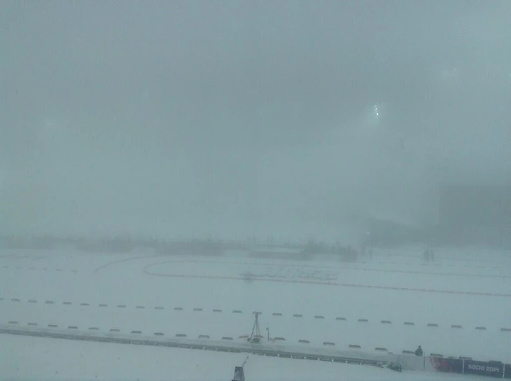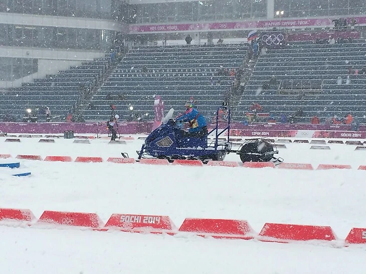 14.12 Вот так сейчас выглядит биатлонная трасса в Сочи. Специальные машины чистят её от осадков, зрителей пока почти нет. Погодка так себе:
