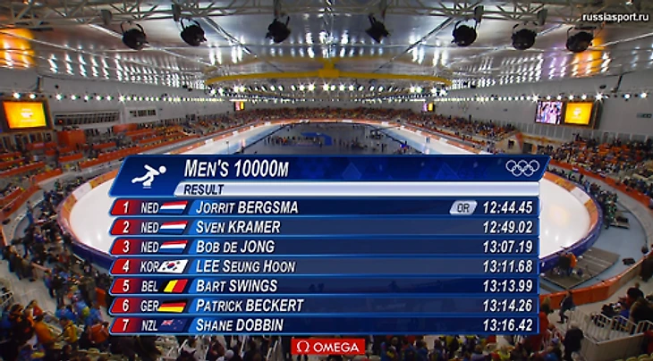 Йорит Бергсма вышел на первое место на дистанции 10 километров с олимпийским рекордом – 12:44.45. Идущий вторым голландец де Йонг отстает от него аж на 22.74 секунды.