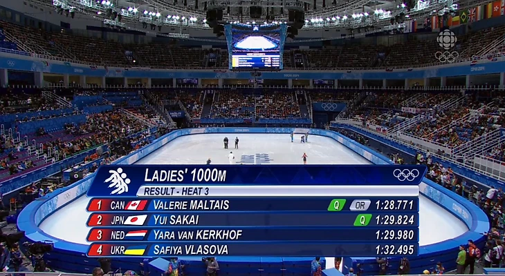 13.45 Кстати, канадка Валери Мальте только что установила олимпийский рекорд в шорт-треке, 1000 м:
