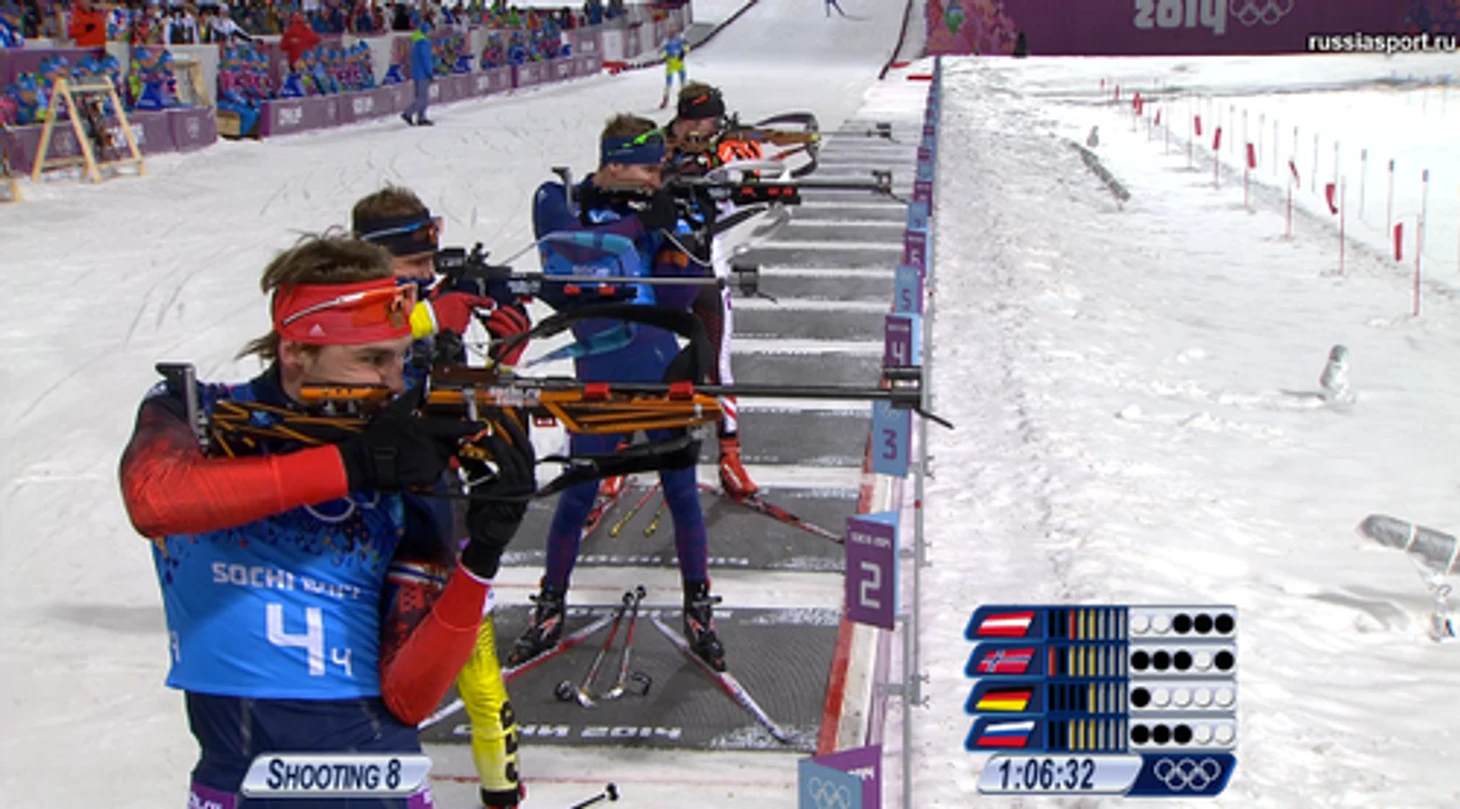 19.34 К главной стрельбе этой гонки четыре сборные подходят вместе. Россия, Норвегия, Германия, Австрия. Кто убежит вперед?