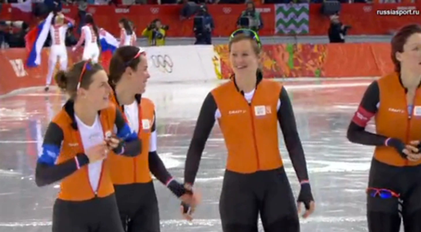 19.27 Это уже даже не особо смешно: Голландия снова выиграла золото в коньках! На этот раз не было равных голландским женщинам в командной гонке. Польша получает серебро, Россия – бронзу!