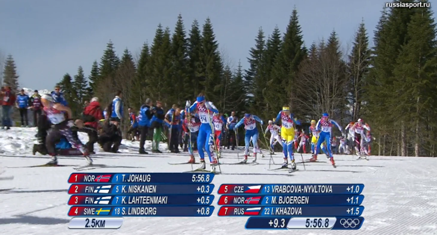 13.30 Стартовала женская гонка на 30 км! В лыжном масс-старте участвуют Бьорген, Уохауг и Венг, Сааринен, Нисканен и Ляхтеэнмяки, Калла и Ковальчик, ну а за Россию бегут Юлия Чекалева, Юлия Иванова, Ирина Хазова и Наталья Жукова. На старте самое главное – не упасть и ничего не сломать.